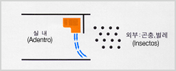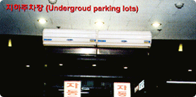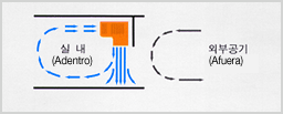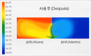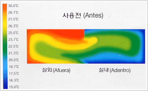 Prevencion de entrada de tierra, gas, malos olores y humo en las entradas de edificios adyacentes a fabricas, calles, incinerador de basura, etc. Imitacion de pruebas de bloqueo de aire caliente con el aire acondicionado (comparacion de la distribucion de temperatura)